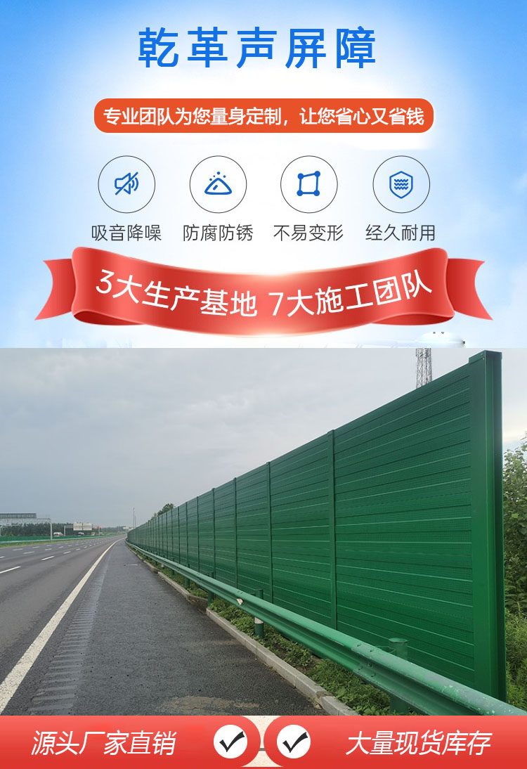 高速公路聲屏障(隔音墻)主要由鋼結構立柱和吸隔聲屏板兩部分組成,立柱是聲屏障的主要受力構件,它通過螺栓或焊接固定在道路防撞墻或軌道邊的預埋鋼板上;吸隔聲板是主要的隔聲吸聲構件,它通過高強彈簧卡子將其固定在H型立柱槽內,形成公路聲屏障(隔音墻)。